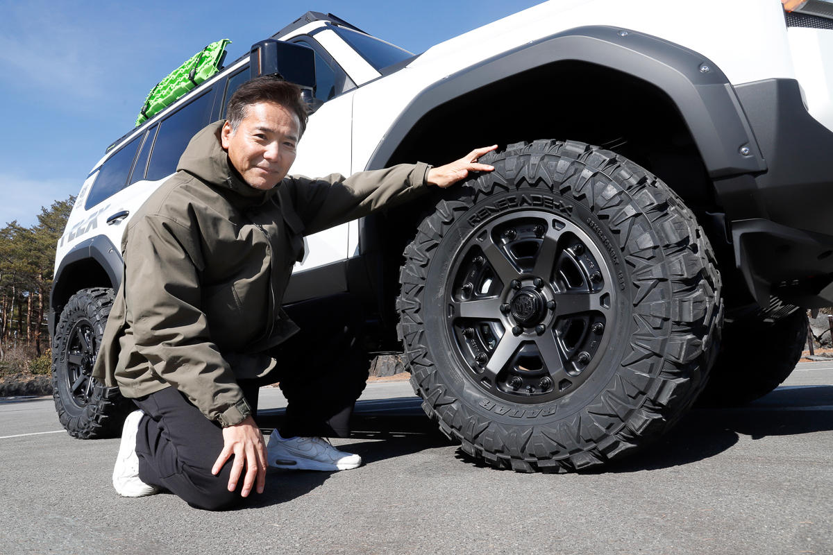 そんなレネゲイドXを履かせたのは、ランドクルーザー250(以下、ランクル250)の2.5インチリフトアップモデルで、ランクル・ハイエースを専門に扱う「FLEX(フレックス)」のデモカーです。