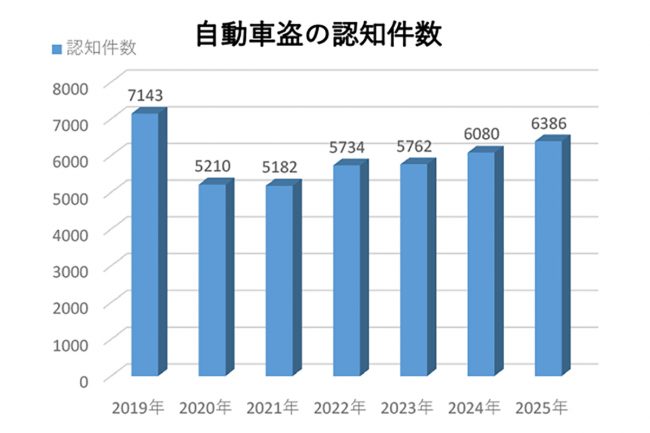 警察庁が発表している統計によると、日本の自動車盗難は長期的には減少してきているものの、直近では再び増加傾向にあります。2024年は6080件と前年より300件あまり増加し、2025年には6386件と、直近5年で最多の件数を更新する形となっています。