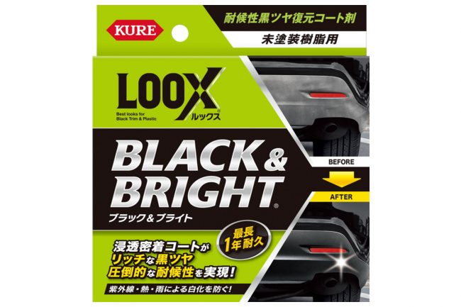 KUREの「LOOXブラック&ブライト」は、洗車後、白化してしまった未塗装樹脂パーツに塗布するだけで、新品のような深みのある上質なツヤを復活させる専用のコーティング剤です。