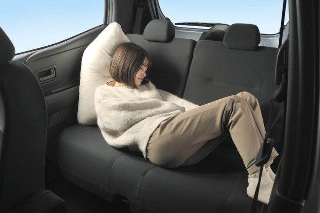 従来品がミニバンなどの大きな車種向けだったのに対し、この製品はSUVやコンパクトカーなどの後席でも快適に使えるよう設計されています。ベンチタイプの後席の「すみっこ」に置いて、背もたれや枕のように使用することで、ドライブ中の仮眠や休憩の質を高めます。