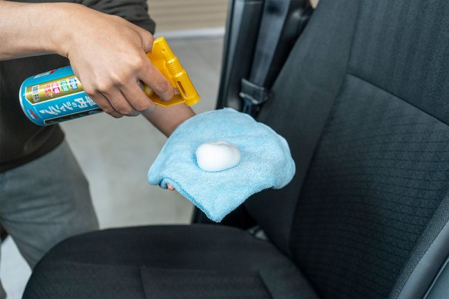電装系へのトラブルを防ぐため、直接スプレーするのではなく、一度タオルに泡を取ってから拭き上げるのがコツ。この使い分けさえ覚えれば、車内のあらゆるパーツを次々と綺麗にしていけます。